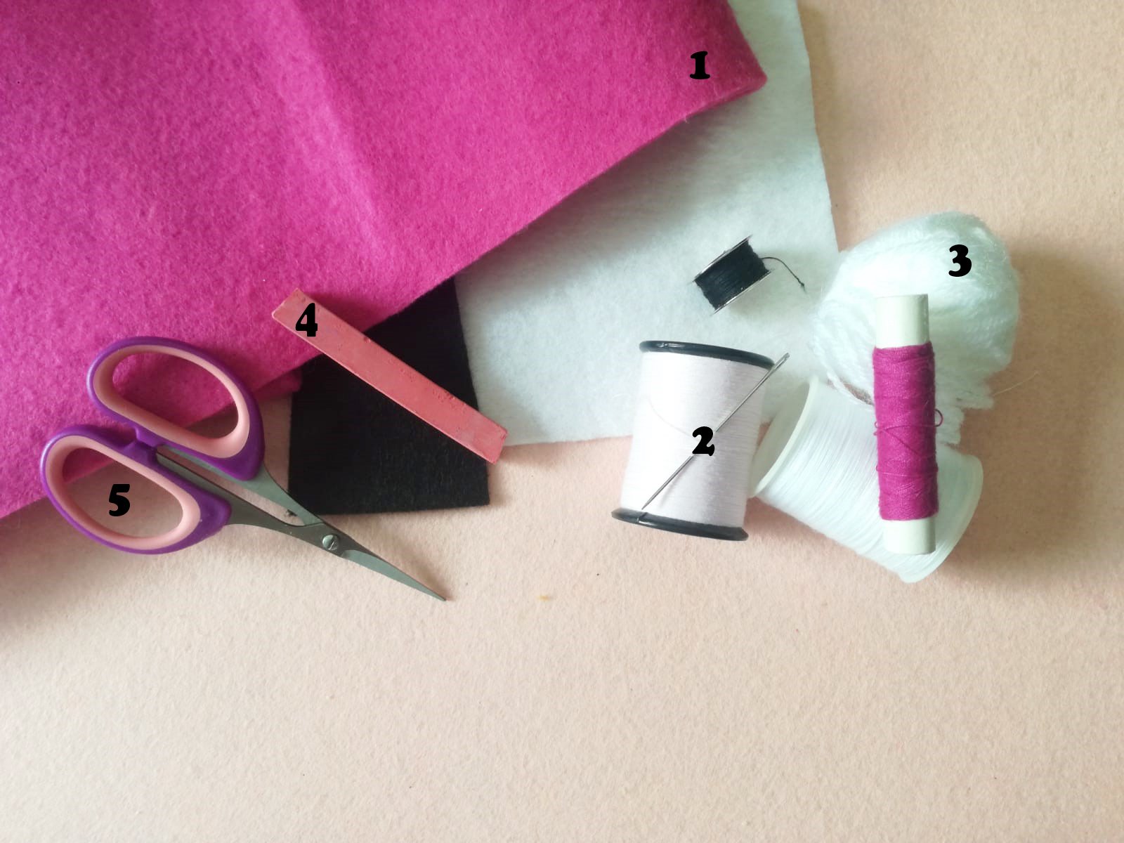 - 1- TELA DE FIELTRO: De tres colores, rosa pálido, rosa intenso, blanco y negro.