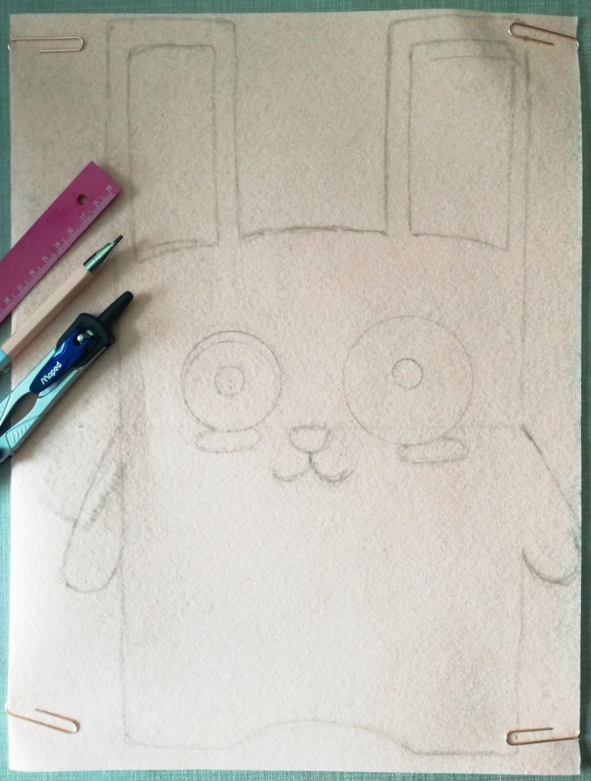 - Coloca dos láminas de fieltro rosa pálido una encima de la otra sujetándolas entre sí con cuatro clips para que no se muevan.