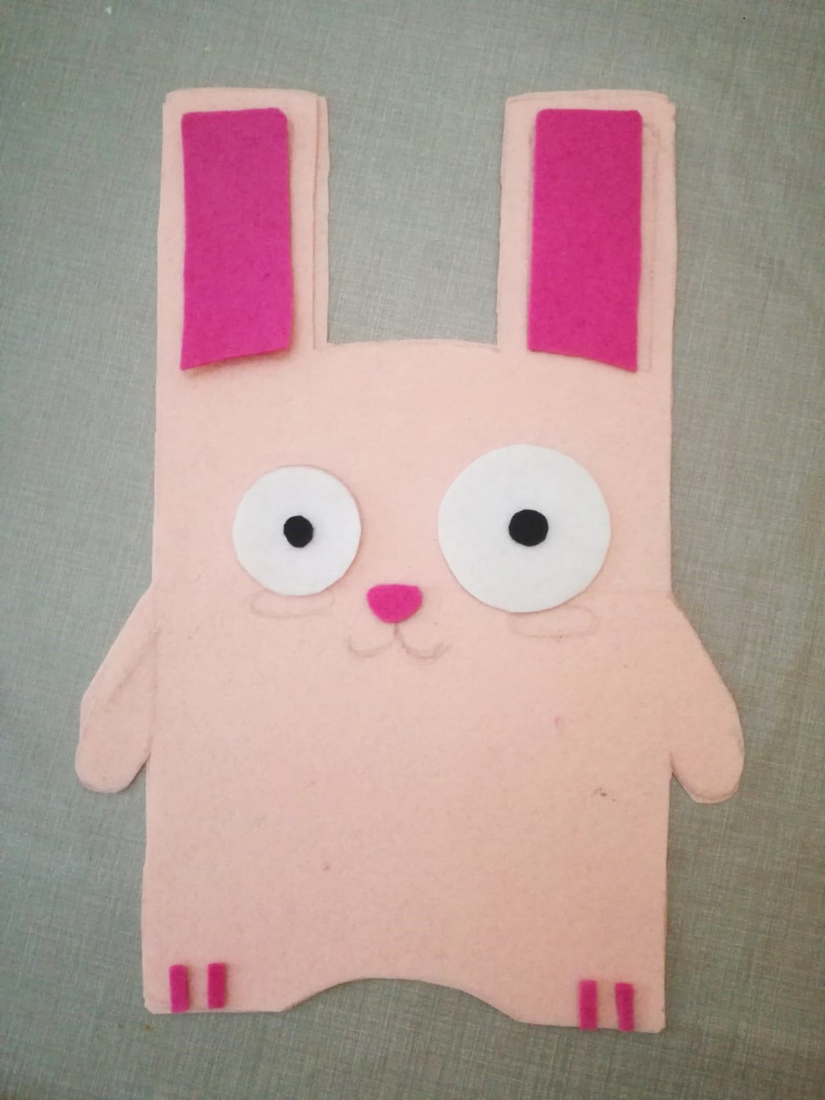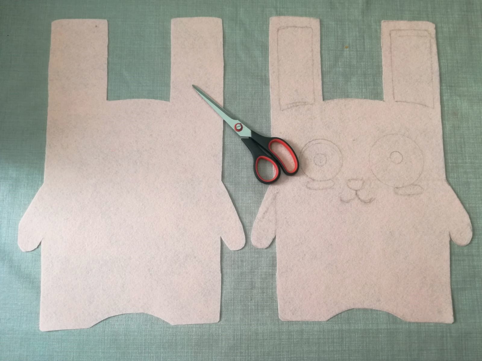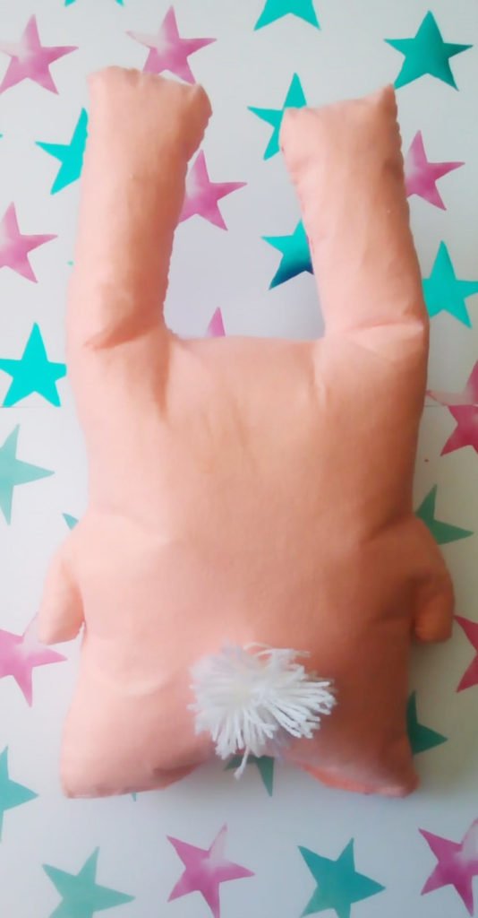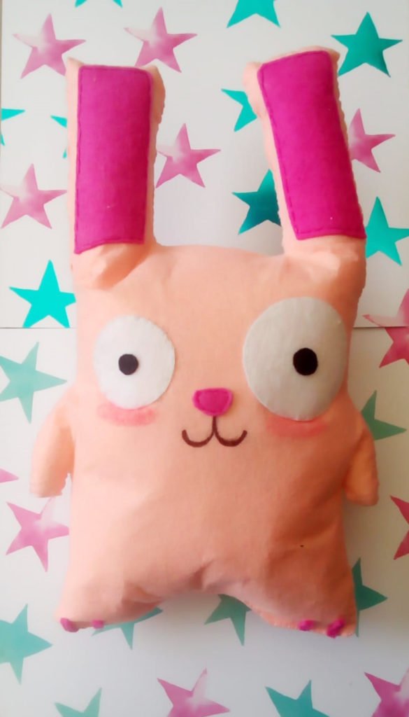 - Recorta el resto de detalles con los otros fieltros de colores. Ojos, nariz, pupilas, orejas, patitas… Y cóselos (o pégalos) en la parte delantera. Si tienes pastel o tiza, colorea sus mejillas como si fuese rubor. Si no tienes este material, recorta dos óvalos y colócaselos.