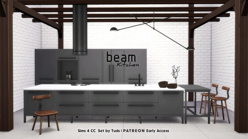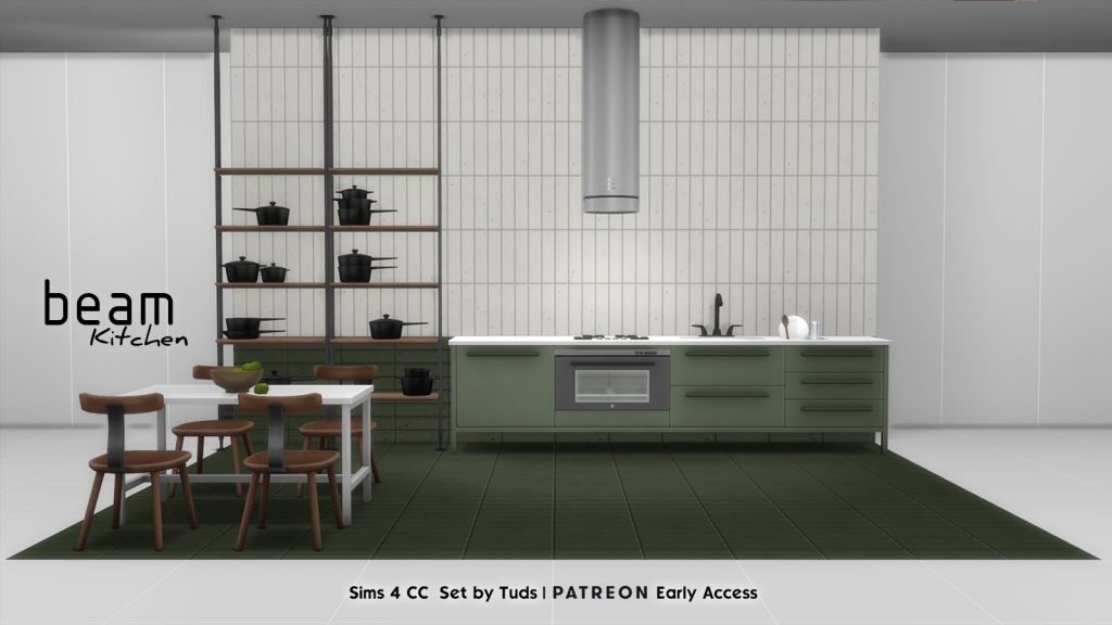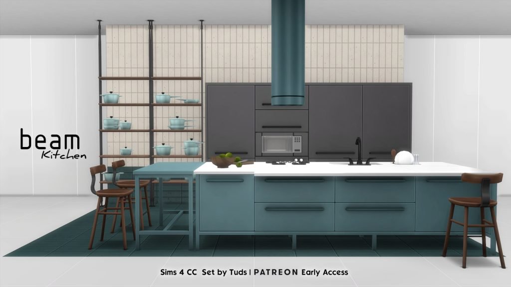 Hoy les traemos un precioso set de cocina para Los Sims 4 de la mano de Tuds, se compone de encimeras estándar, encimeras de formato de islas, cinco variantes de gabinetes, lámparas, fregaderos, cuatro elementos decorativos de Clutter, una silla, un taburete, una barra, una mesa, 2 pinturas de pared de concreto y 1 suelo de concreto