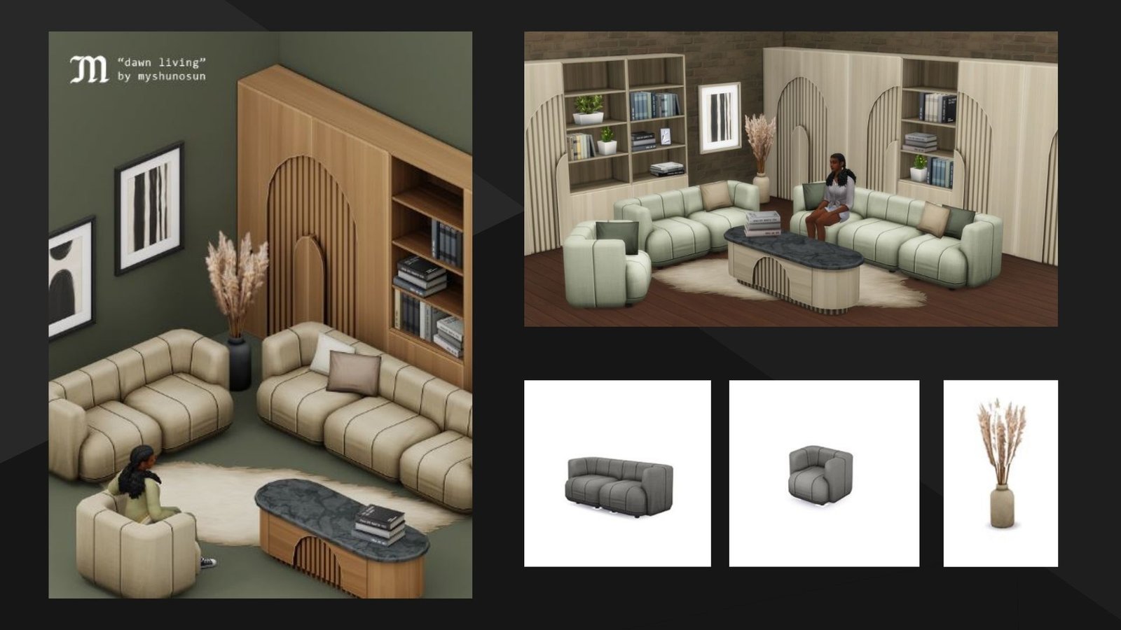 Un@ de nuestr@s creador@s favoritas, Myshunosun, ha creado un nuevo set de muebles para los Sims 4, el set “Dawn Living”.