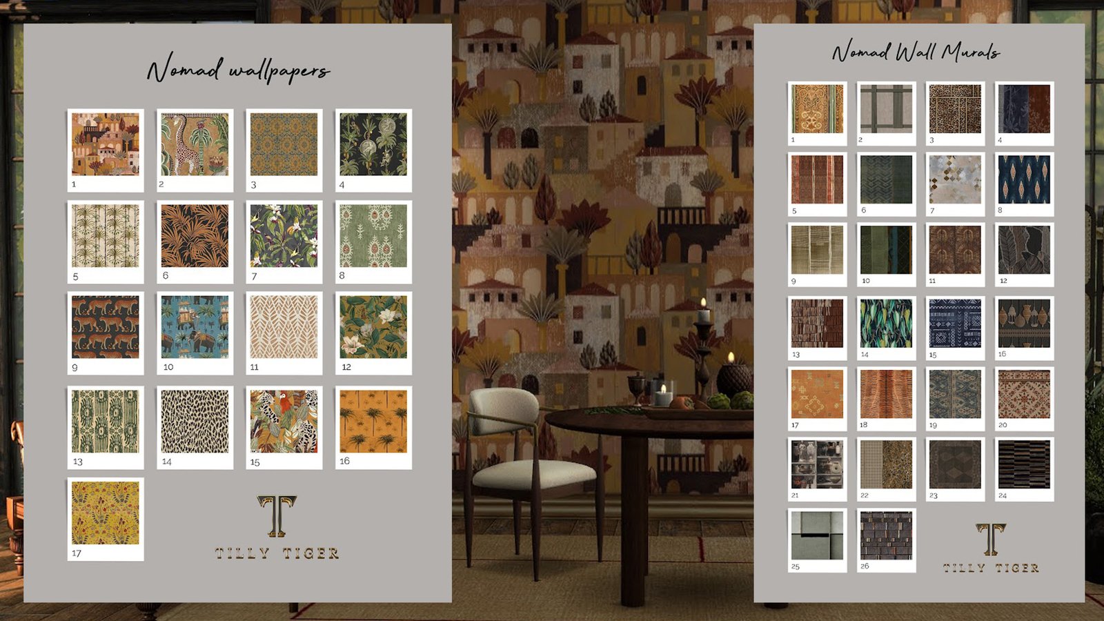 Su más reciente creación es un verdadero viaje de inspiración alrededor del mundo. Se trata de la colección Nomad, que consiste en 26 murales (que forman un patrón) y 17 papeles tapiz. La colección es tan grande que la tuvo que dividir en dos entregas para descargar. ¡Infaltable para que los Sims viajen sin moverse de su casa!