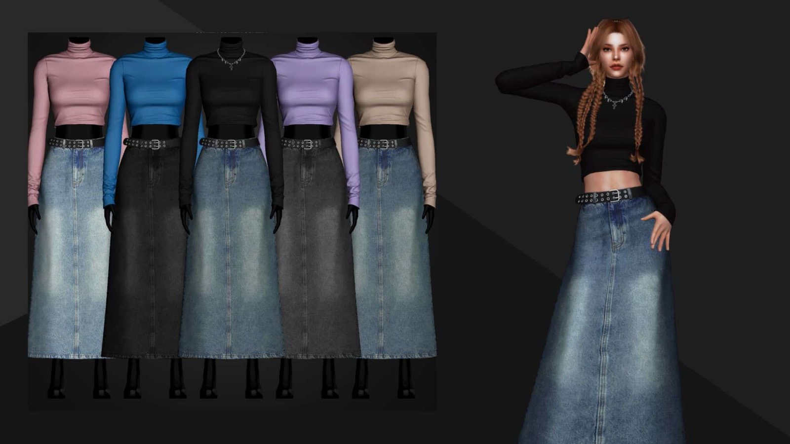 Gorillax3 ha creado este maravilloso conjunto compuesto por dos piezas, jersey de cuello alto y falda vaquera, para mujer para los Sims 4.