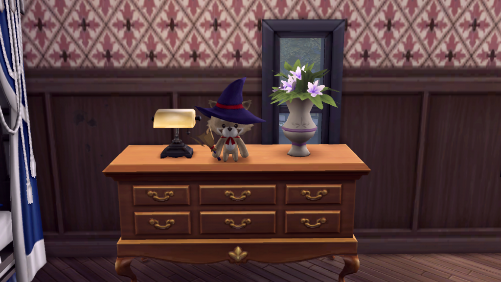Tenemos un Osito que más bien parece un tejón, este sostiene una escoba y sombrero de bruja y un moño rojo.