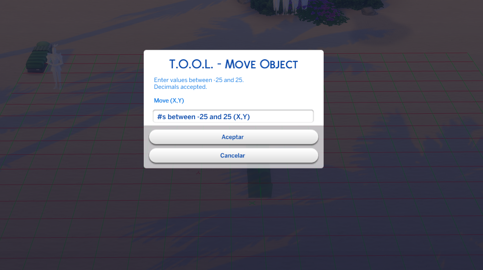 Abrimos la consola de trucos ( Crtl+shift+C ) y metemos testingcheats true, aunque podéis descargaros el .package “Alwaystesting” del patreon de TwistedMexi que activa el testingcheats directamente. Una vez activado el truco, pinchamos en modo vivir y haciendo SHIFT + botón izq del ratón sobre el objeto abriremos un menú y hay que entrar en TOOL y pincha en MOVE y nos saldrá un menú para introducir unas coordenadas.