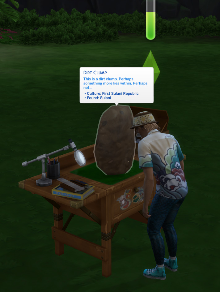 Para que tu Sim empiece a descubrir excavaciones arqueológicas en cualquier mundo, necesita Arqueología en 4 y realizar sobre el suelo la interacción “Buscar montón de tierra”. Si aún no tiene ese nivel de la habilidad, podrías comprarle en la biblioteca un libro de Arqueologia para que vaya aprendiendo, o ponerle al solar el rasgo de Sitio Arqueológico (Archeological Site) que viene con el mod, y eso hará que empiecen a salir al azar excavaciones en la zona del solar.
