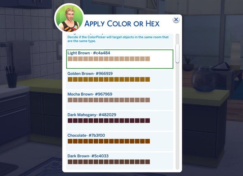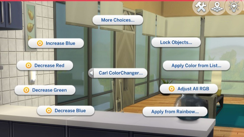 Todas las opciones de cambio de color se pueden hallar en el menú Carl ColorChange que se encuentra al presionar Mayúscula y hacer clic en un objeto (para apuntarlo) o en el suelo (para apuntar a la habitación definida por Los Sims 4).