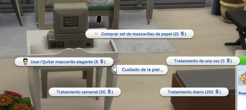 - Tratamiento de una vez: Como su nombre indica consiste en que tu Sims se tratan una vez la cara con algún tipo de mascarilla (de leche, algas, barro, pepinillo etc..) puede que simplemente con una sesión tengan suficiente para poder combatir el brote de acné o quizás necesitan más de una sesión, pero no tiene porque usarse si solo tiene brotes, si no que que puedes hacerlo como un cuidado más de tu Sim para mantener un piel cuidada, suave y mimada.