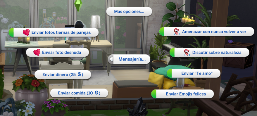 Según el estado del sim cambiará el tipo de mensaje que puedes mandar, por ejemplo desde fotos desnuda a tu amante, novio o tu crush por ”accidente”, hasta un mensaje de te amo, pasando por triste si te encuentras triste, de chiste si te encuentras vacilón etc.. O incluso comenzar un discusión vía mensaje con aquella persona que odias. Lo bueno e interesante de este sistema es que afecta directamente a la relación de Los Sims tanto positivamente como negativa, e incluso puedes obtener contestación de esos mensajes enviados o incluso recibir una llamada de ánimo de aquella persona con la que has hablado vea mensajería. Esto y muchas más opciones que te invito que puedas investigarlo tú.