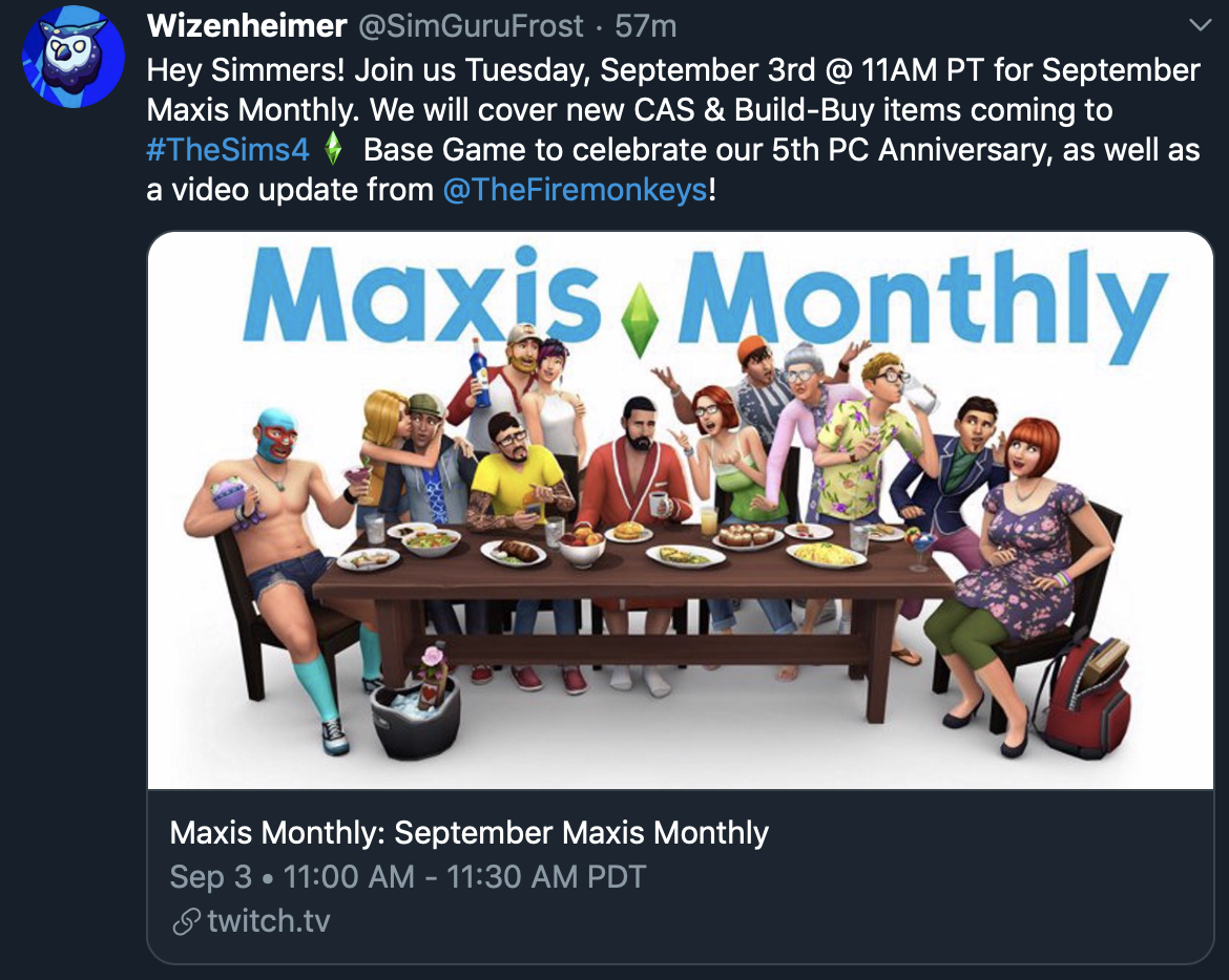 ¡Hola Simmers! únanse a nosotros el martes 3 de septiembre a las 11:00 a.m para el Maxis Monthly de septiembre. Enseñaremos nuevo contenido de CAS y Modo Comprar que llegarán al juego base Los Sims 4 para celebrar el 5 aniversario en PC, así como una actualización de video de @TheFiremonkeys!