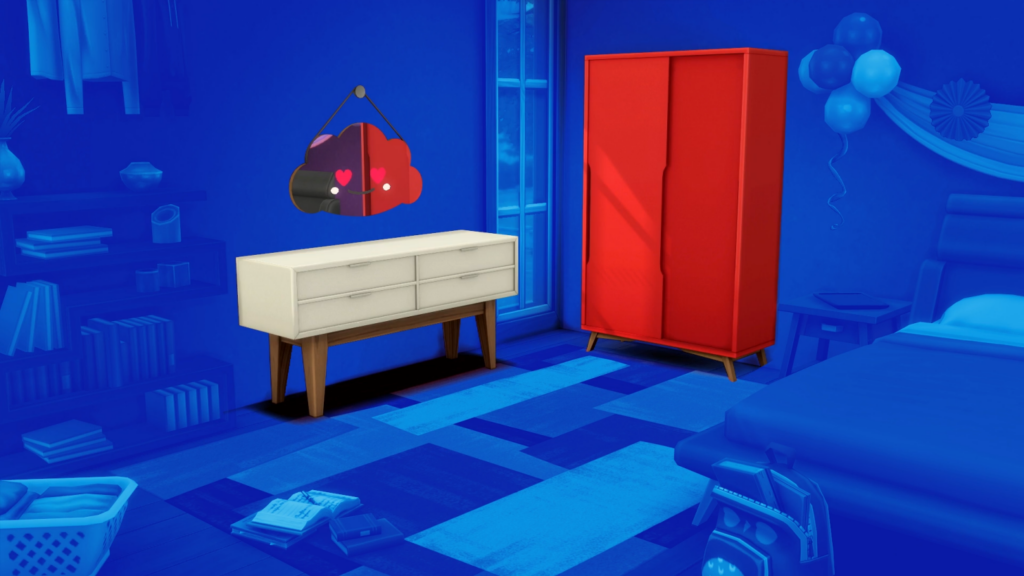 “El armario fue uno de mis primeros conjuntos para el cuarto. De nuevo, es de mitad de siglo. Lo creé porque, en ese entonces, no había muchos armarios en el juego y pocos eran modernos. Al no tener un clóset integrado, es un mueble que uso en mi día a día. Me gusta que sirva como alternativa a un aparador y aporta un interés visual a un cuarto por su altura. También me encantó el detalle de las patas y el diseño de las puertas corredizas. También es un gran ejemplo de mi amor por el color, agregando toques de color por toda la habitación.
