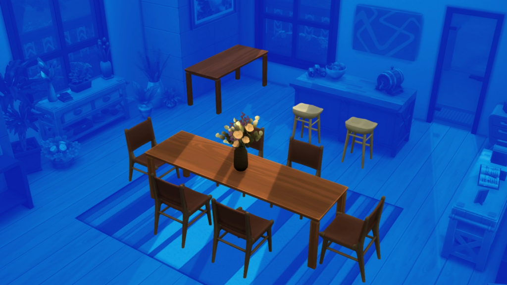 ¿Por qué estas creaciones?: “Creé los muebles como parte de una cocina más amplia. Las mesas, en concreto, las creé porque quería una mesa de madera simple y versátil que combinara con cualquier estilo. Sin embargo, el ramo de flores fue la última pieza que hice antes de enviarlas a que las consideraran. Estoy muy feliz de poder incluirlo, porque es muy raro que se añada un ramo de flores al juego y yo comparto, como muchos otros miembros de la comunidad, un gran amor por las plantas en el juego, ya que le dan vida a la casa”.