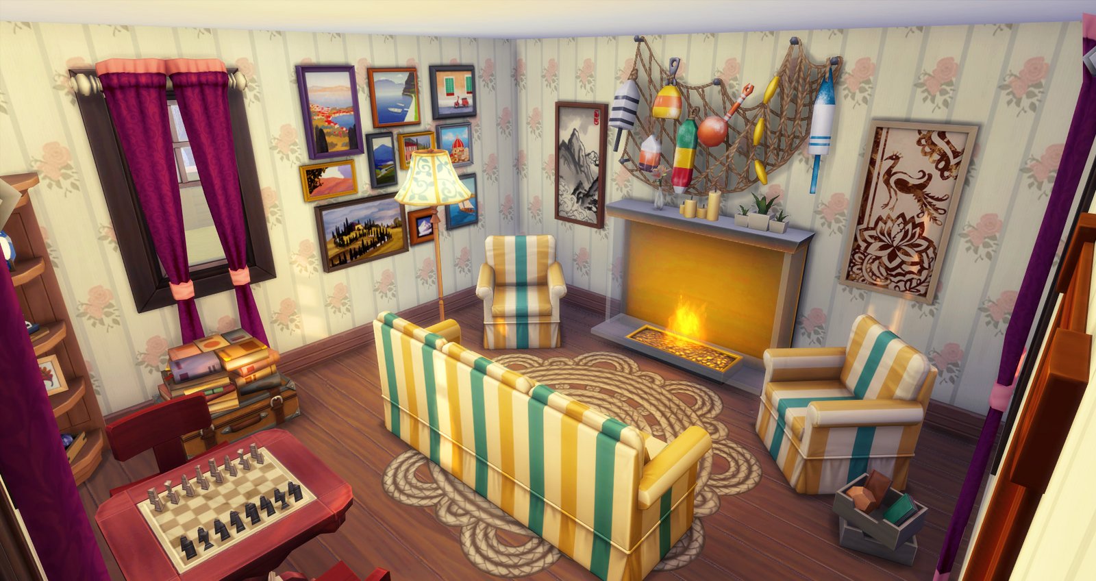 Esos sofás no me gustan nada por que los encuentro muy anticuados y la verdad no pensé que pudiera lograr hacer que esta habitación se viera decente jaja, menos al agregarle el tapete de cuerda que vino con Perros & Gatos. Agregarle la chimenea con un estilo más moderno no estuvo mal.