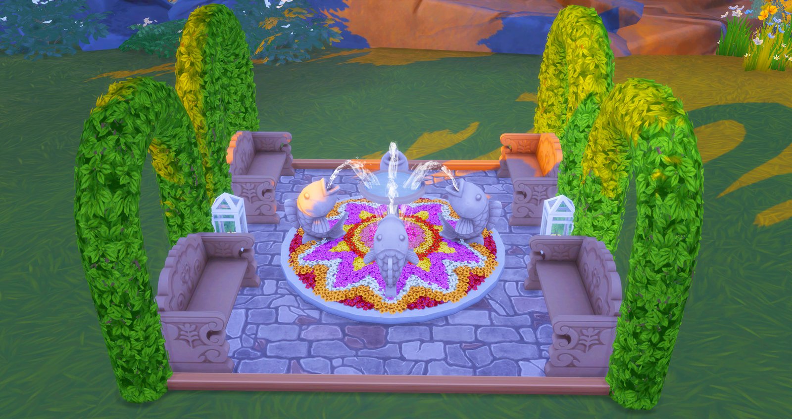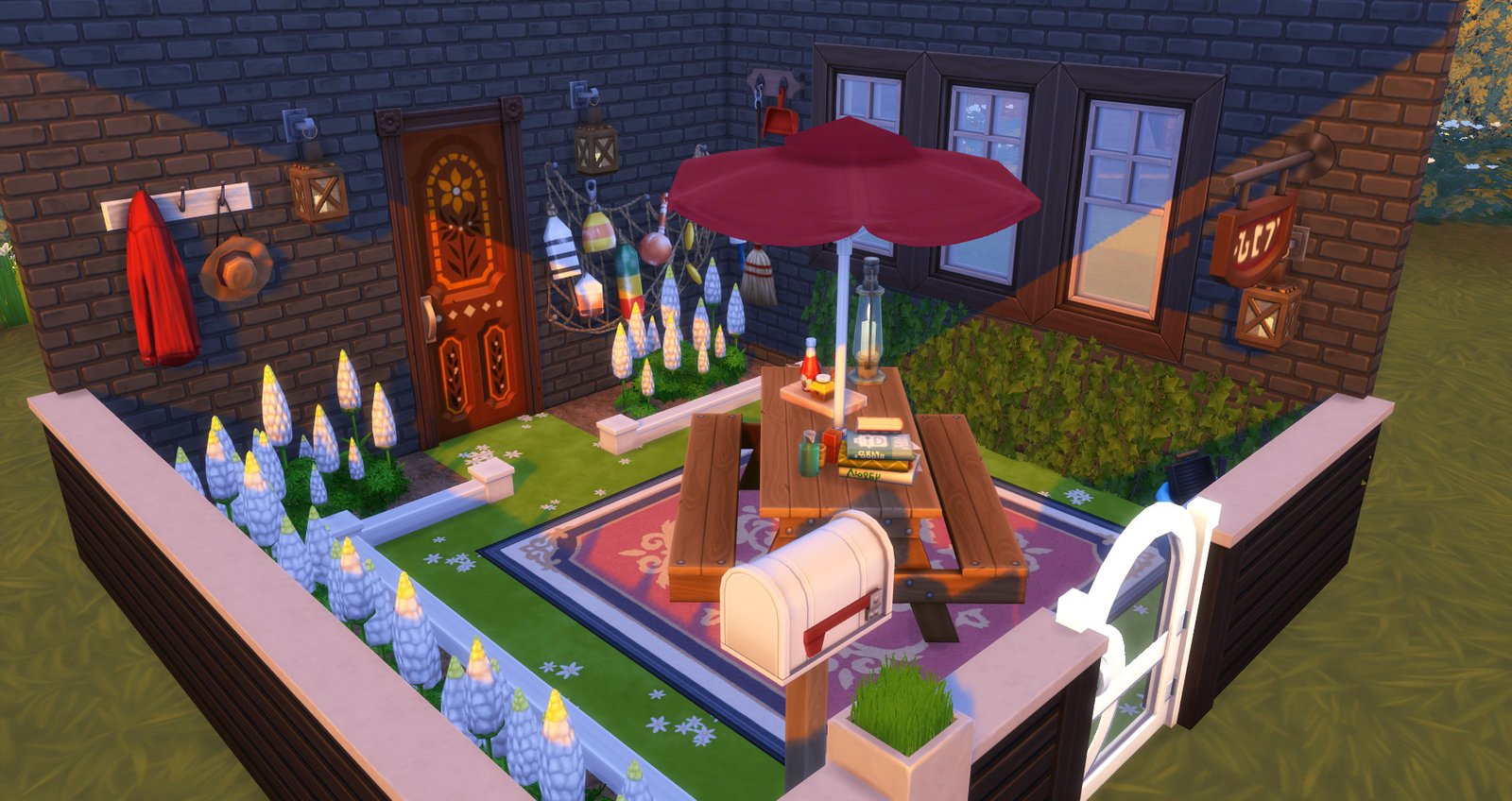 A pesar de que las flores no me gustan por que creo que tienen un estilo demasiado alienígena, creo que se ve bastante bien en este pequeño patio, la mesa al centro acompañada de algunos objetos que le den ese toque realista no me desagrada nada. Creo que los objetos para decorar las paredes hicieron un buen trabajo con la red de pesca.