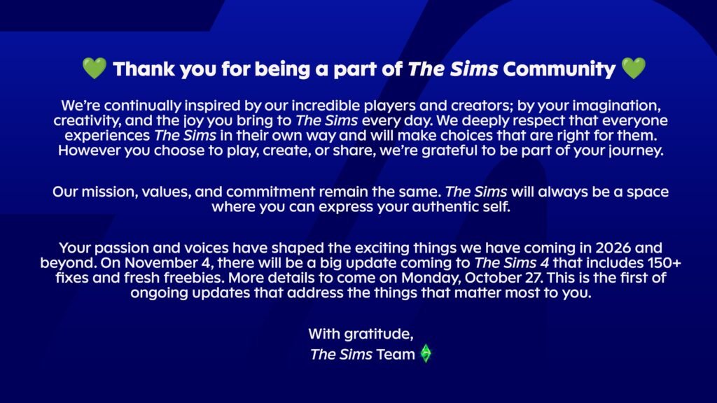 Ante la conversación en la comunidad, el equipo de Los Sims compartió un mensaje dirigido a los jugadores, reforzando que la esencia del juego no cambiará.
