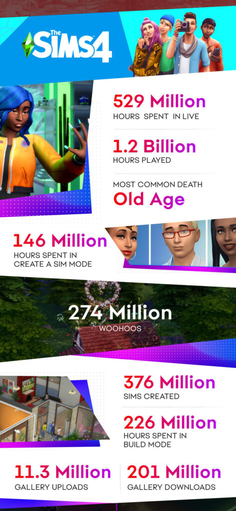 En Los Sims ™ 4 , los jugadores se sumergieron en el juego con más de mil millones de horas jugadas, creando 376 millones de Sims . Los Sims nos inspiran a hacer que el arte imite la vida y a crear un mundo único para cada uno de nosotros. Cuando las experiencias de la vida real eran limitadas, los jugadores recreaban reuniones familiares, de amigos y sociales a las que no podían asistir en persona.