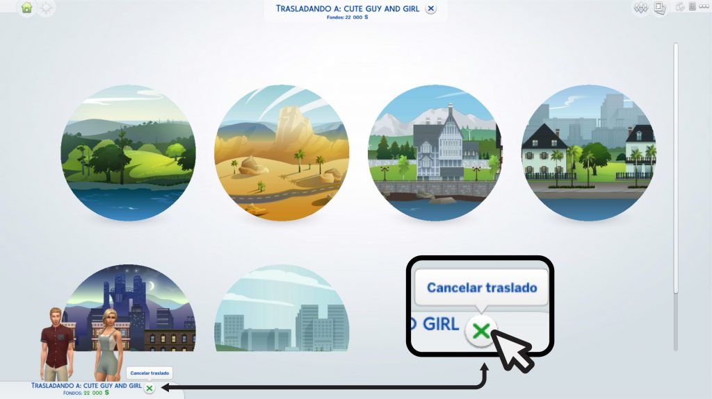 En vez de mudar al Sim, lo que vas hacer es cancelar la mudanza o el traslado, de manera que tu Sim se va quedar sin casa osea fuera de el mundo, y se agregara por defecto a la sección unidades domesticas fuera de el mundo.