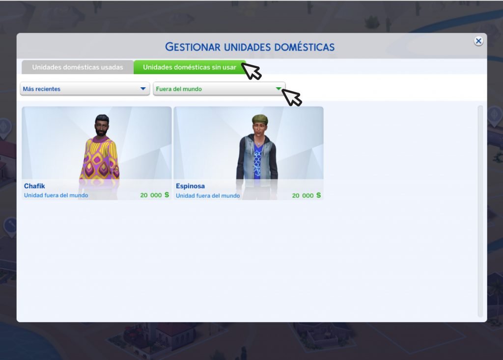 Cuando tu juego necesite townies lo primero que intentara es coger Sims de la lista de ”Sims que no viven en ningún mundo”, ahí es que caen todos esos Sims adicionales. El truco para tener townies a tu gusto es borrar a los existentes y luego llenar esa lista con tus propios Sims o bajarlos de la galería, así el juego no tendría que generar Sims porque ya tendrá de donde coger Sims. A continuación te mostramos como hacerlo: