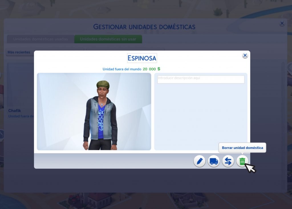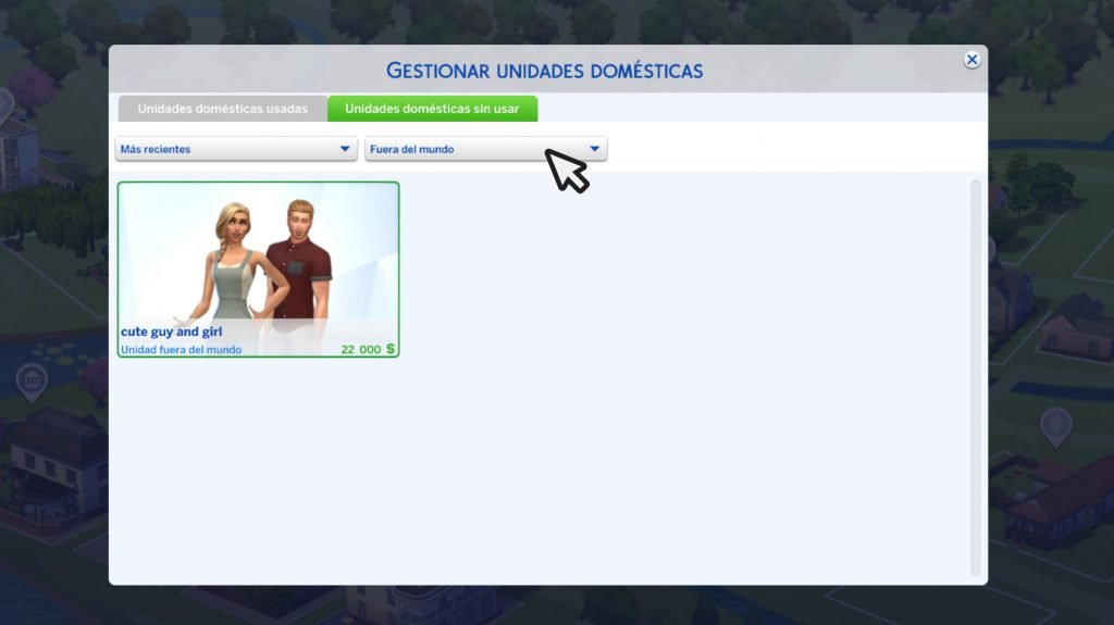 ¡Listo ya borraste a todos los townies que no querías! Ahora solo queda poblar esta sección con Sims de tu gusto. Se hace de esta manera: Entras al menú principal y le das al botón de crear una nueva unidad domestica para hacer un Sim o una familia, en esta parte tienes dos opciones, crear un Sim o descargalo de la galeria. Cuando tengas a tu townie listo, haz clic en aceptar, esto te llevara al selector de mundos para mudar a tu Sim, y a partir de aquí es donde te enseñamos el truco: