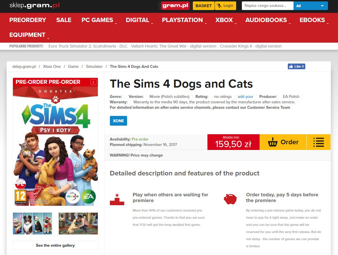 La tienda de videojuegos polaca, sklep.gram.pl publicó en su lista a la venta, la expansión Perros & Gatos para PS4 y XboxOne con fecha de lanzamiento 16 de noviembre de 2017, la misma semana que sale Los Sims 4 para consolas.