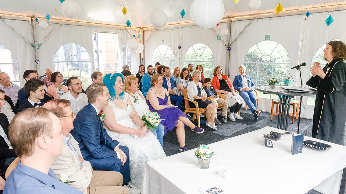 Wouter: Queríamos casarnos en algún lugar de la ciudad, pero las tarifas eran increíblemente elevadas. Al final optamos por una solución mucho más barata: el jardín de mis padres. Colocamos una enorme carpa en él y celebramos la boda allí.