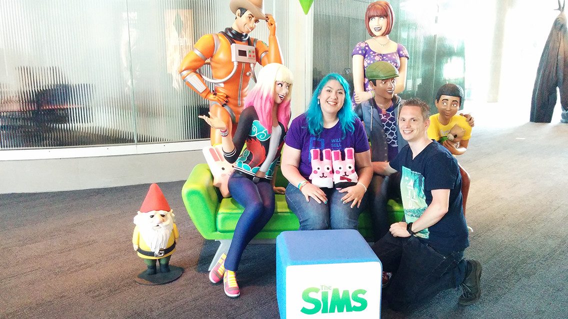 Rosana: Cuando llegamos a EA, nos sacamos unas fotos en ese sofá de Los Sims tan chulo que hay en el vestíbulo. Luego hicimos una visita guiada al interior del estudio de Los Sims que resultó muy especial. Me impresionó en particular el cubículo de SimGuruSarah. ¡Era monísimo y muy de Los Sims!